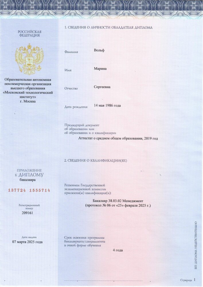 Место обучения: Московский технологический институт, Факультет управления, направление «Менеджмент. Управление человеческими ресурсами.», 5 лет обучения, 2020–2025гг, 700 ак.ч.